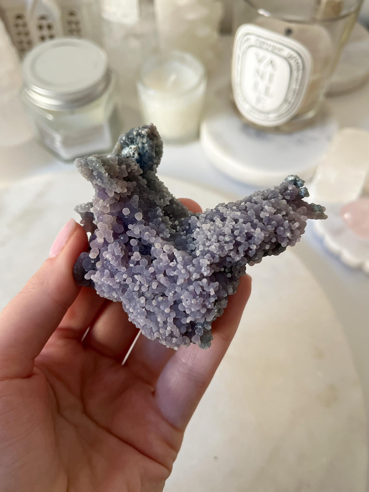Praca z agatem winogronowym może pomóc w rozpraszaniu negatywnych myśli i toksycznej energii, które utrudniają doświadczanie szczęścia i wewnętrznego spokoju. Ułatwia zasypianie (i wpływa na jakościowy sen), pomaga w zrozumieniu znaczenia snów.
