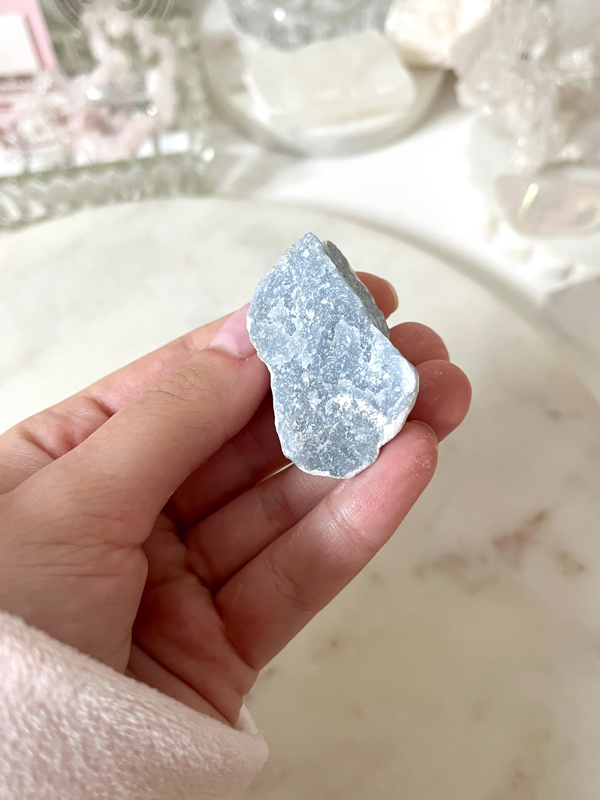 Angelit - znany ze swoich właściwości kojących i wyciszających, pomaga w uzyskaniu spokoju i harmonii. Angelit jest również uznawany za ogromne wsparcie w rozwoju duchowym. Pozwala na połączenie się z intuicją i wyższą świadomością. Zwiększa wiarę w siebie, obdarowuje wspierającą i wzmacniającą energią.