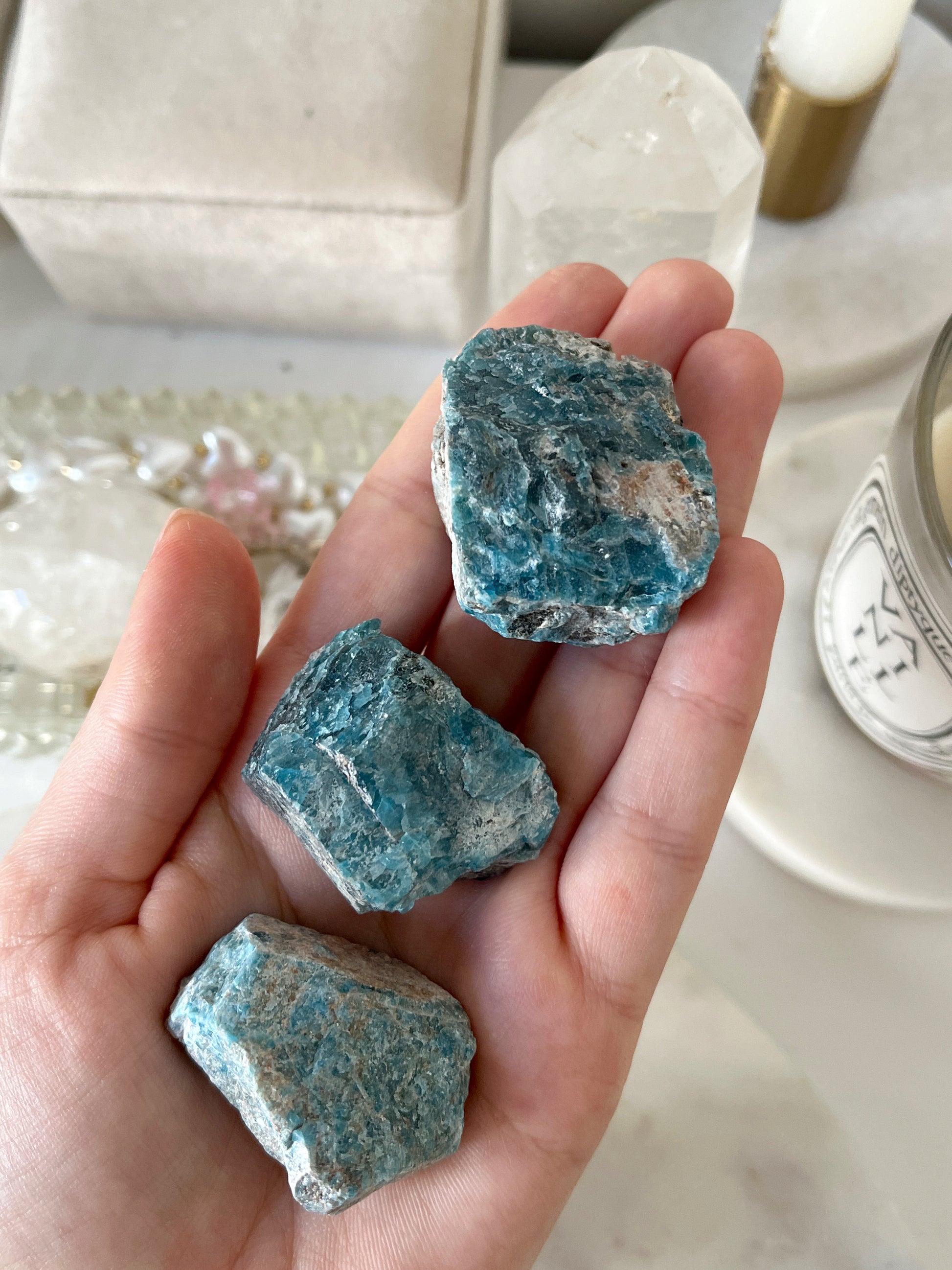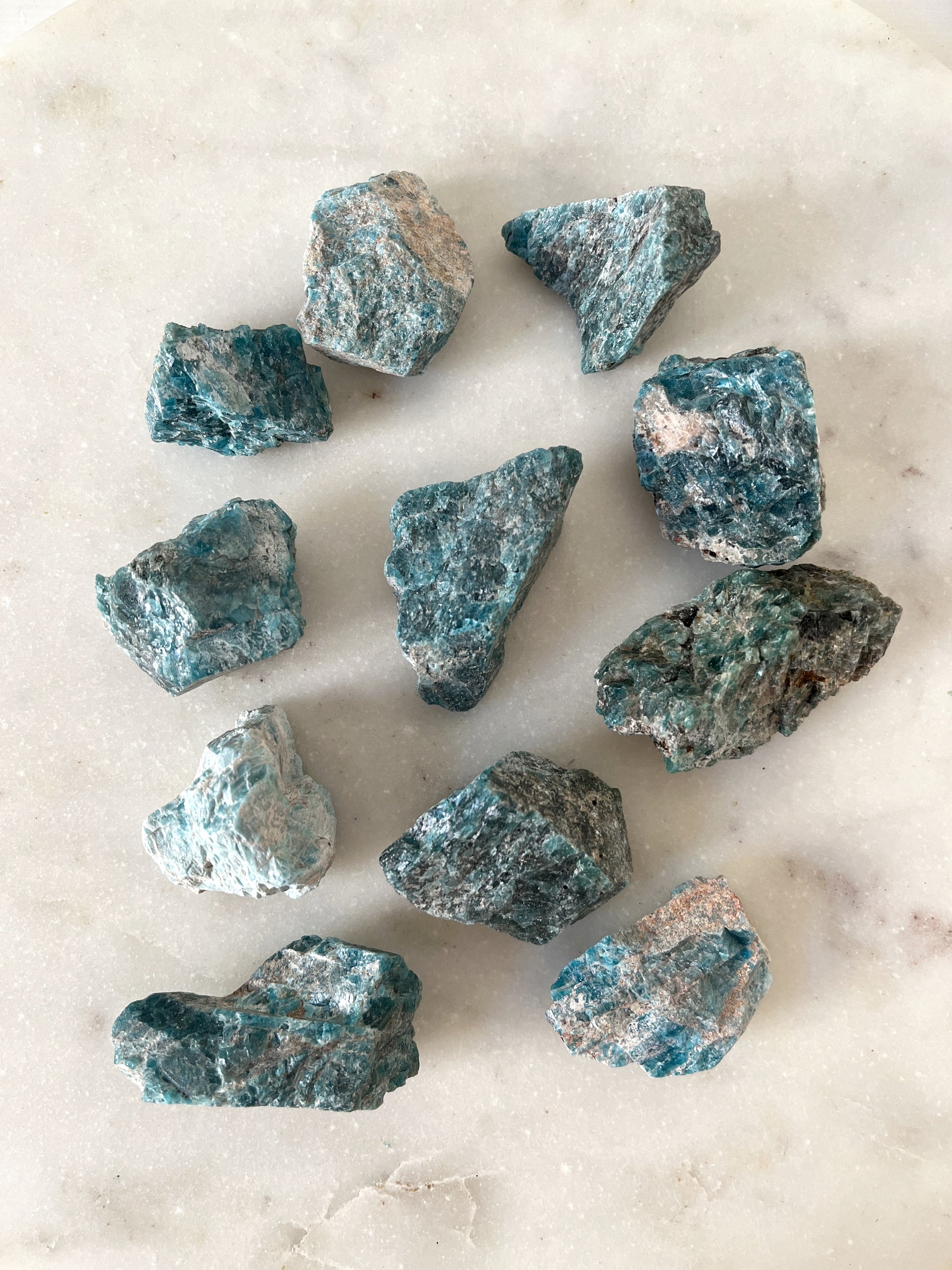 Apatyt - uważa się, że apatyt wspomaga rozwijanie intuicji i umożliwia dostęp do głębszych warstw wiedzy i mądrości. Jest również powiązany z manifestacją i przyciąganiem pozytywnych doświadczeń, pomagając skoncentrować się na celach i ich realizacji. Używany do łagodzenia stresu, lęku i napięcia oraz pobudzania uczucia radości i wewnętrznego spokoju. Uważa się, że apatyt wspiera również komunikację i wyrażanie uczuć, pomagając w radzeniu sobie z trudnymi sytuacjami i budowaniu harmonijnych relacji.