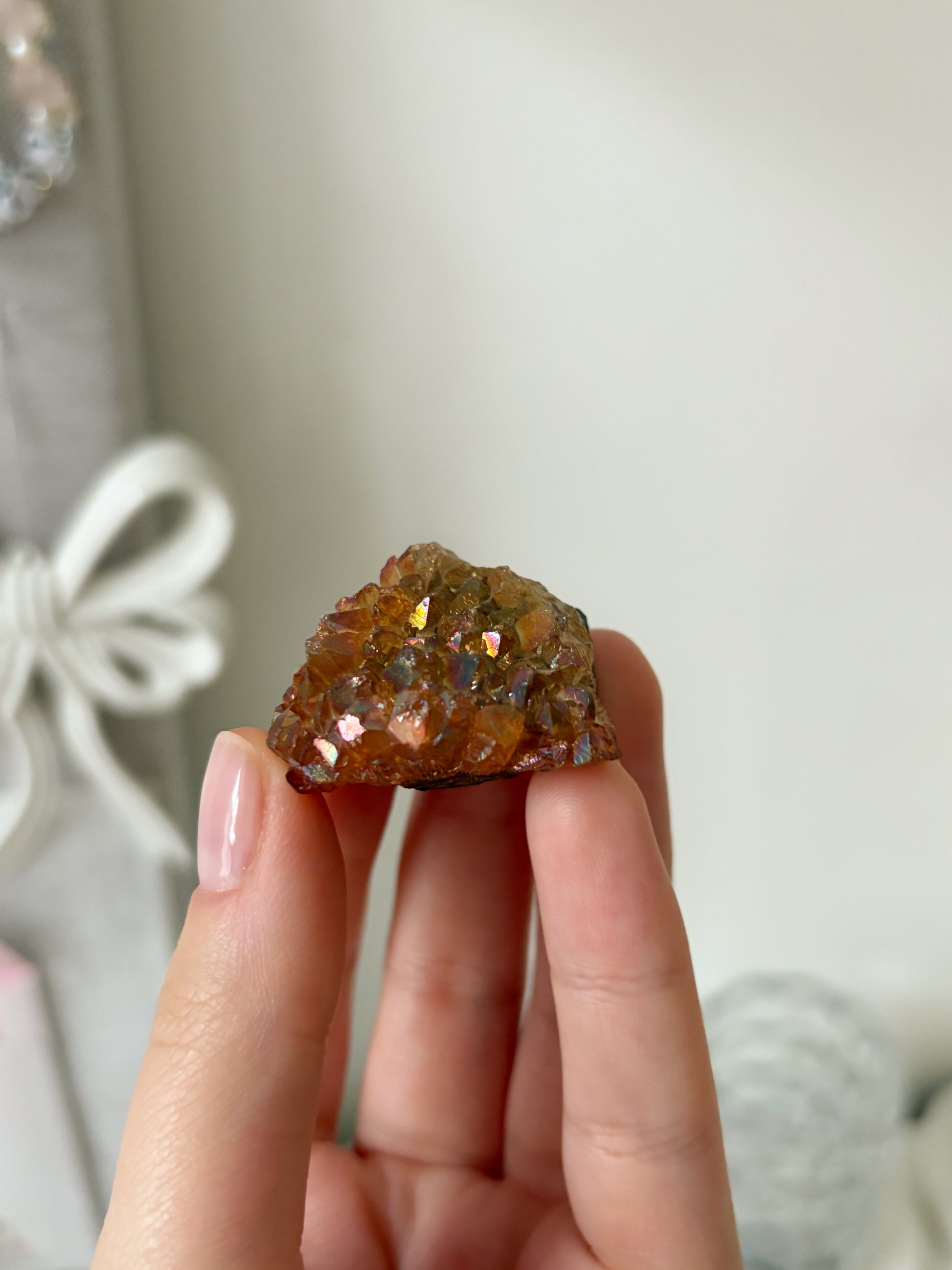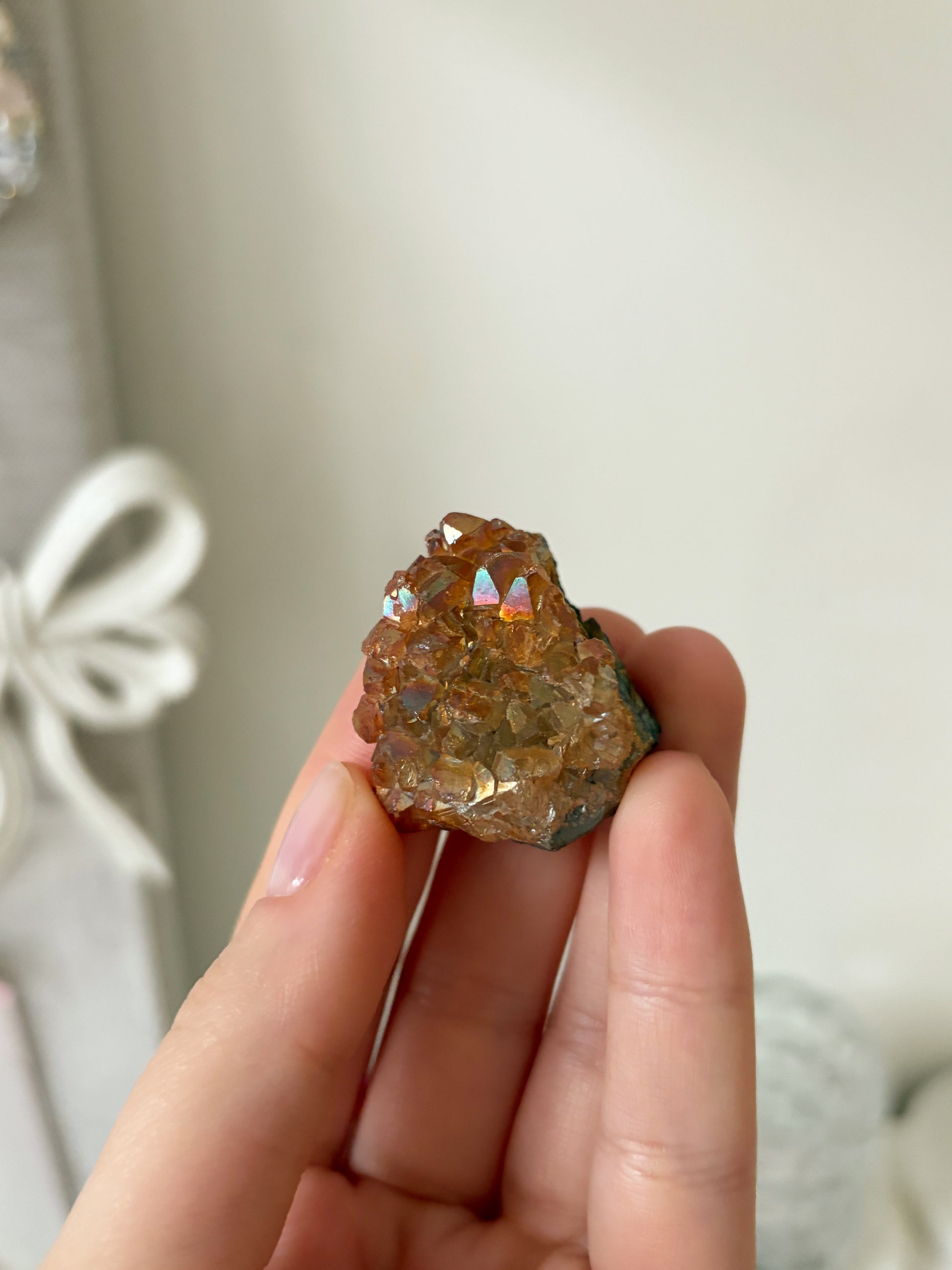 Kwarc aura (kwarc anielski, angel aura) - uważany za potężny kamień oczyszczenia i harmonii. Działa jak wzmacniacz energii, pozwalając skupić się na celach i realizować marzenia. Często kojarzony z rozwojem intuicji i zdolności do odczytywania subtelnych energii. Pomaga otworzyć trzecie oko i aktywować zdolności wizji psychicznych. Minerał ten posiada wyjątkowo wysoki poziom wibracji energetycznych. Trzymanie go w pobliżu może pomóc w podniesieniu własnych wibracji, rozwoju duchowym i połączeniu z wyższą świadomością.