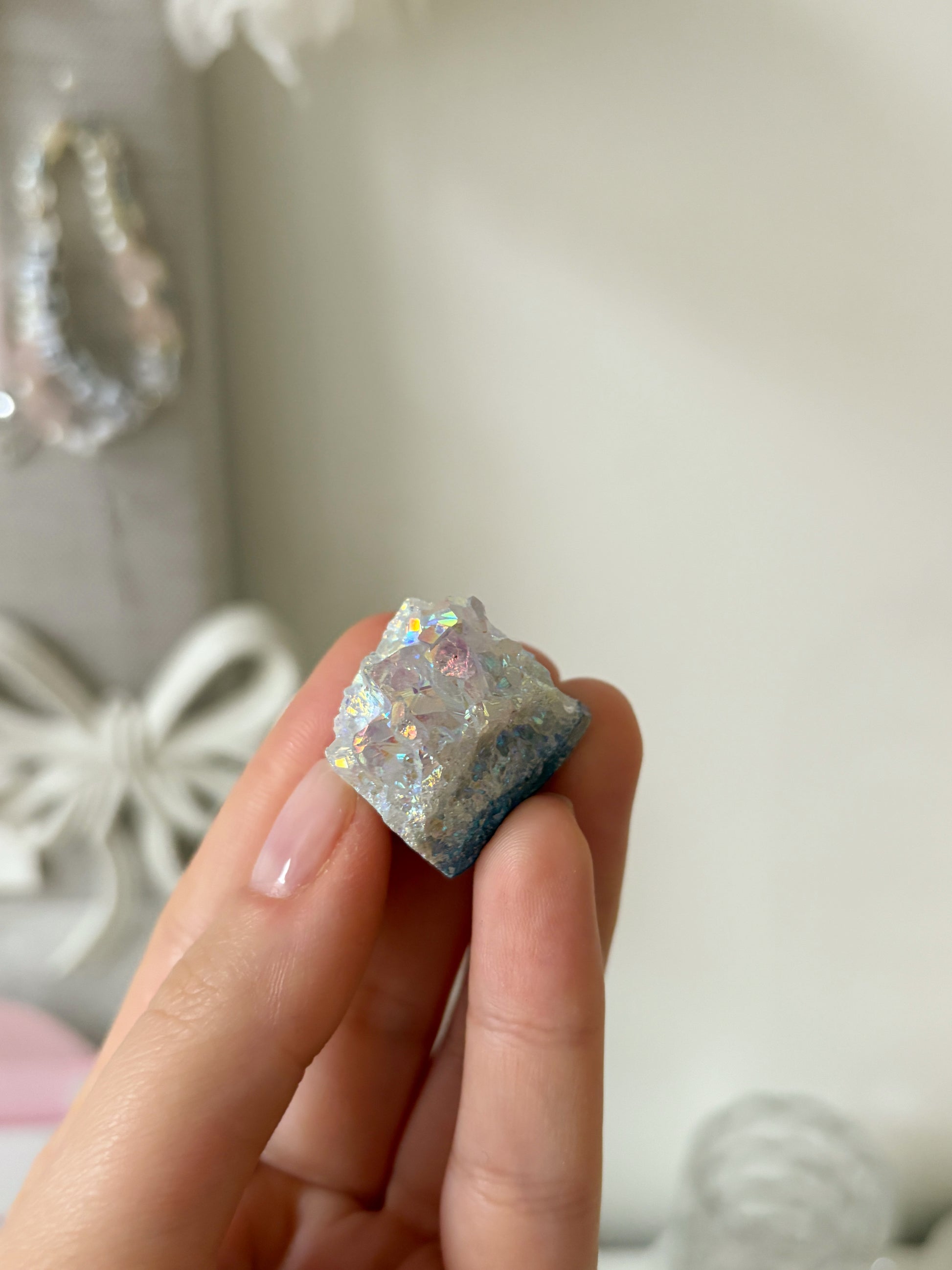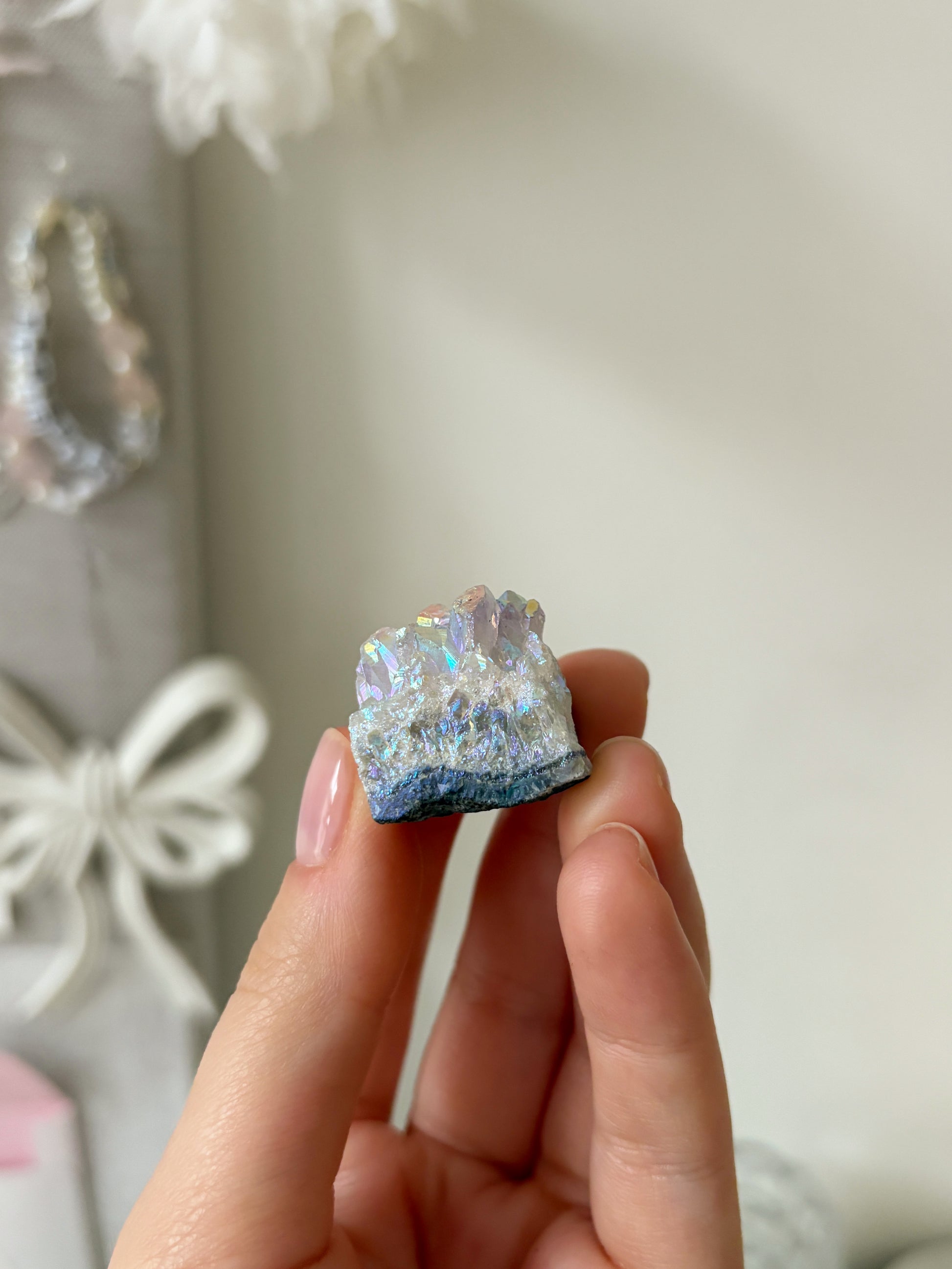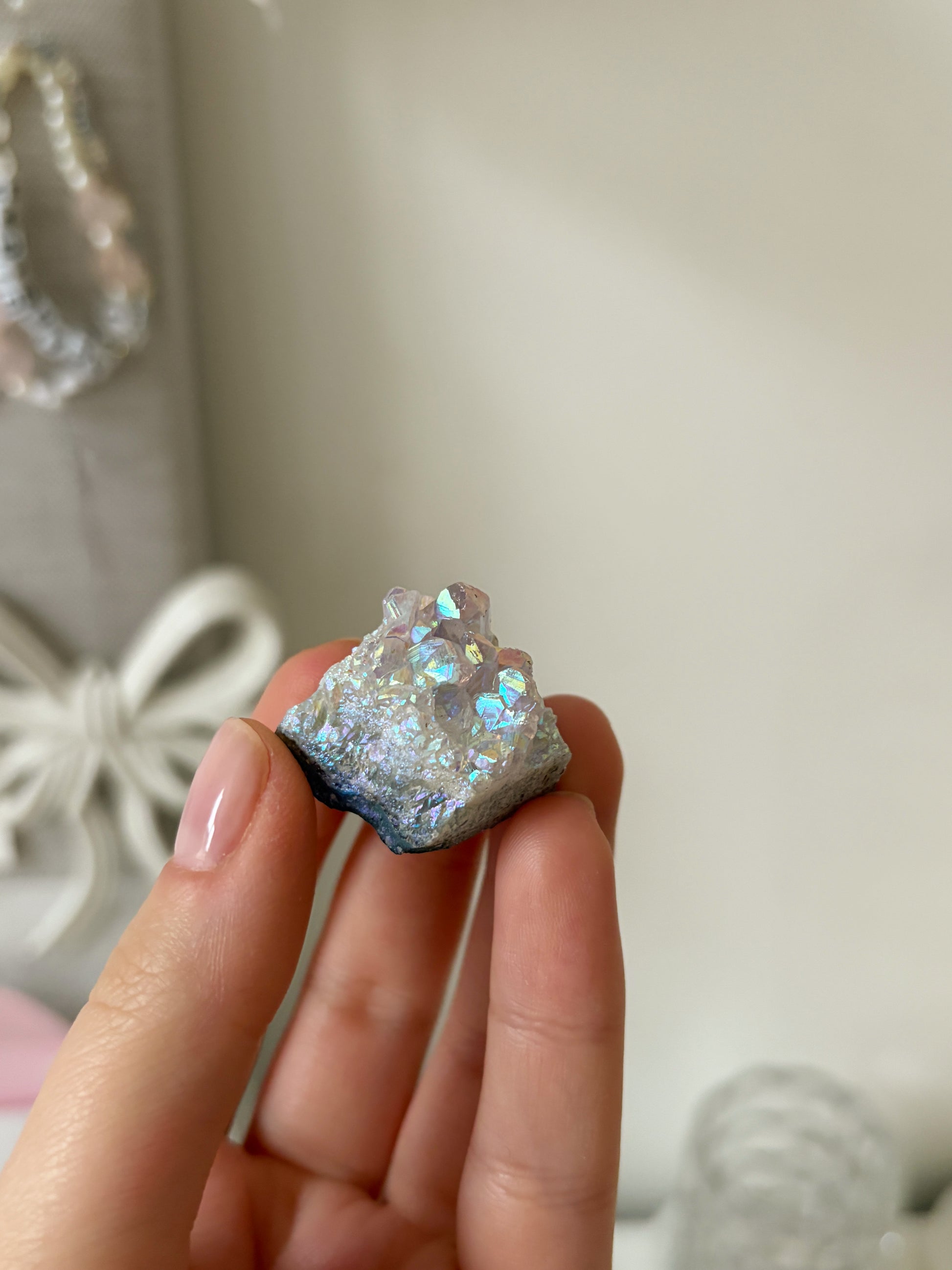 Kwarc aura (kwarc anielski, angel aura) - uważany za potężny kamień oczyszczenia i harmonii. Działa jak wzmacniacz energii, pozwalając skupić się na celach i realizować marzenia. Często kojarzony z rozwojem intuicji i zdolności do odczytywania subtelnych energii. Pomaga otworzyć trzecie oko i aktywować zdolności wizji psychicznych. Minerał ten posiada wyjątkowo wysoki poziom wibracji energetycznych. Trzymanie go w pobliżu może pomóc w podniesieniu własnych wibracji, rozwoju duchowym i połączeniu z wyższą świadomością.