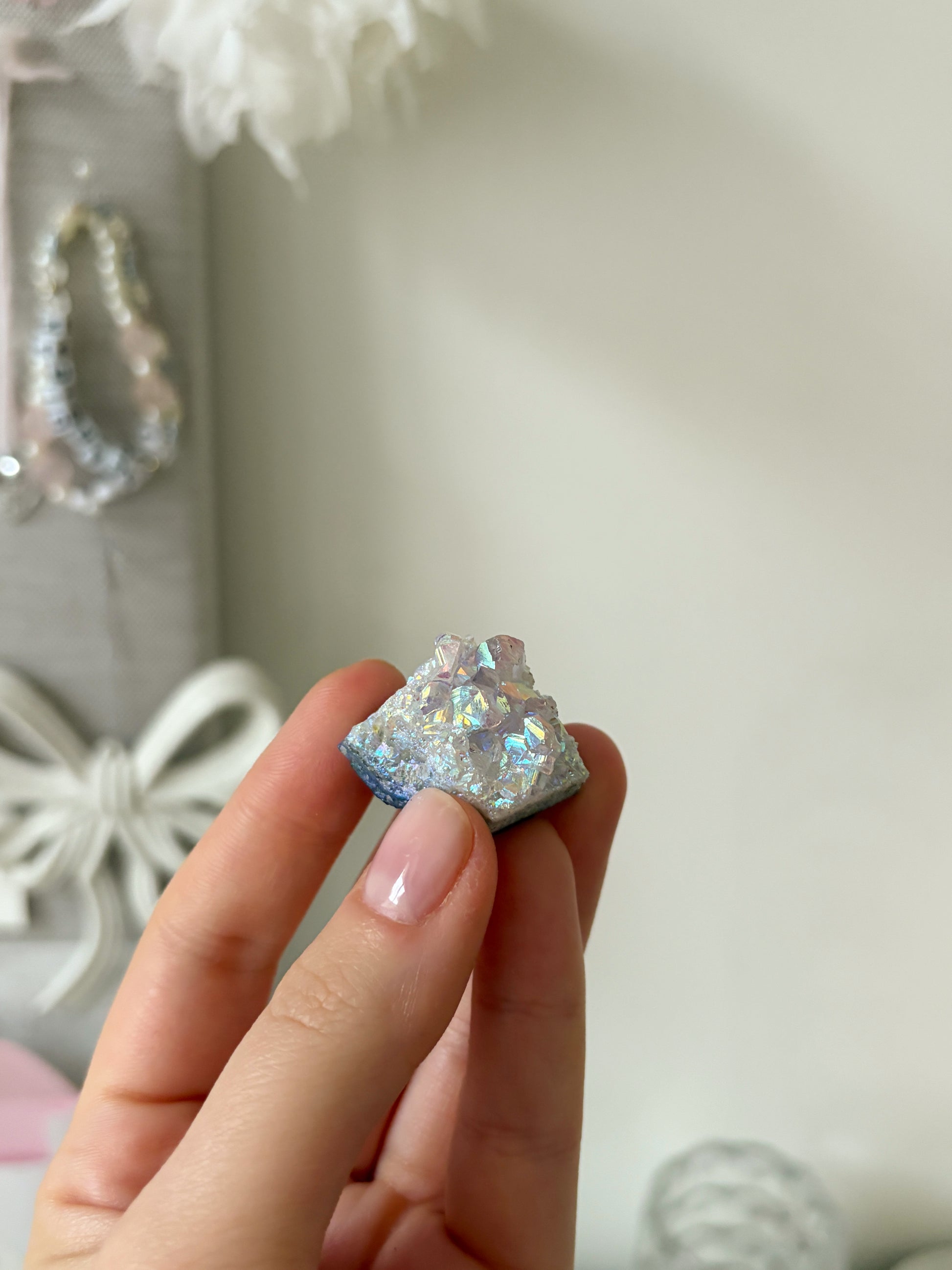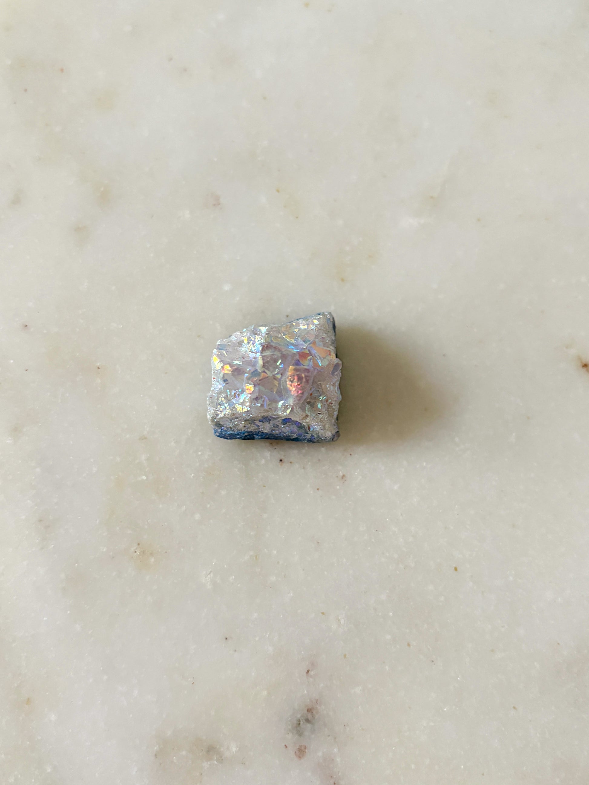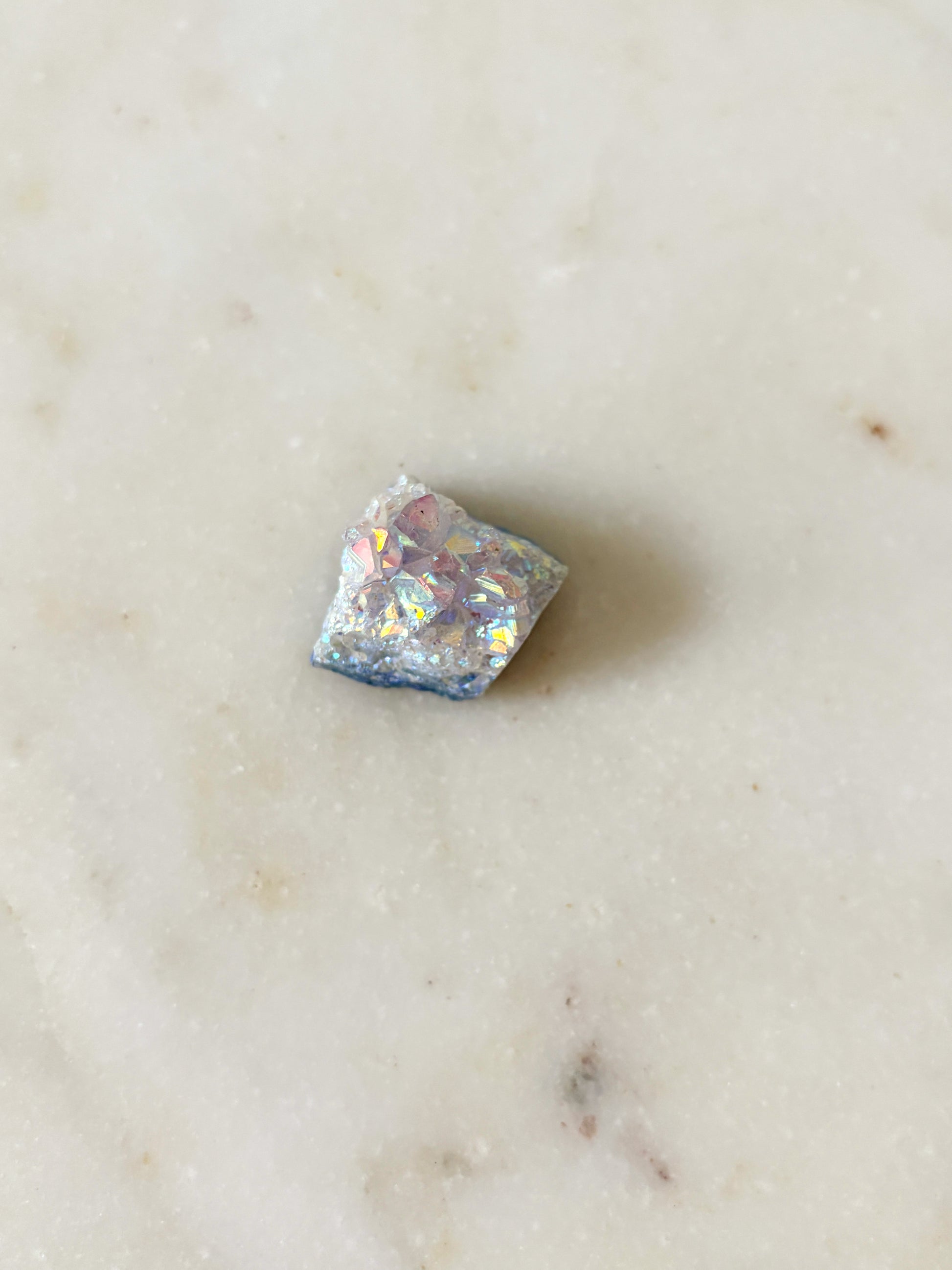 Kwarc aura (kwarc anielski, angel aura) - uważany za potężny kamień oczyszczenia i harmonii. Działa jak wzmacniacz energii, pozwalając skupić się na celach i realizować marzenia. Często kojarzony z rozwojem intuicji i zdolności do odczytywania subtelnych energii. Pomaga otworzyć trzecie oko i aktywować zdolności wizji psychicznych. Minerał ten posiada wyjątkowo wysoki poziom wibracji energetycznych. Trzymanie go w pobliżu może pomóc w podniesieniu własnych wibracji, rozwoju duchowym i połączeniu z wyższą świadomością.