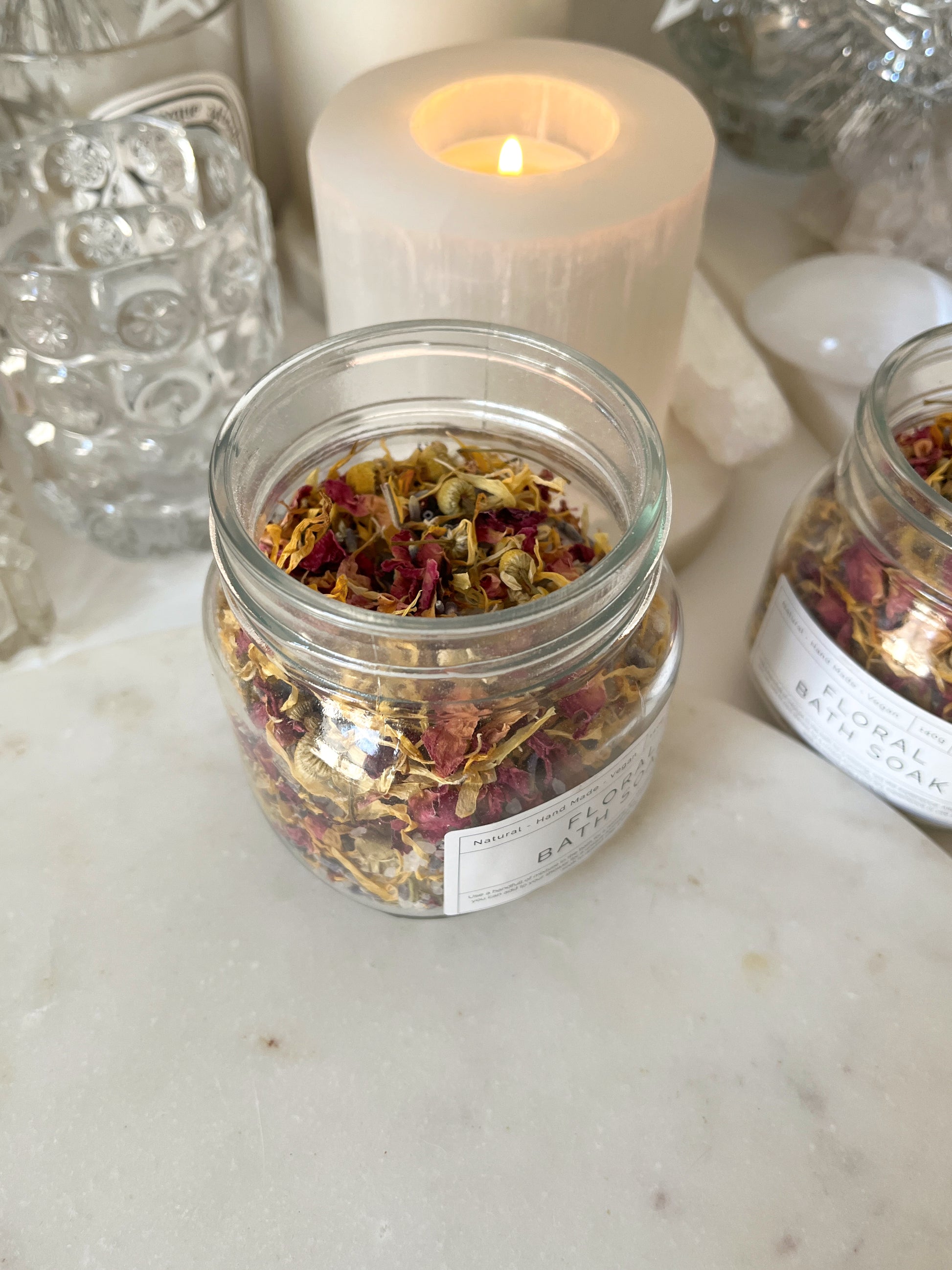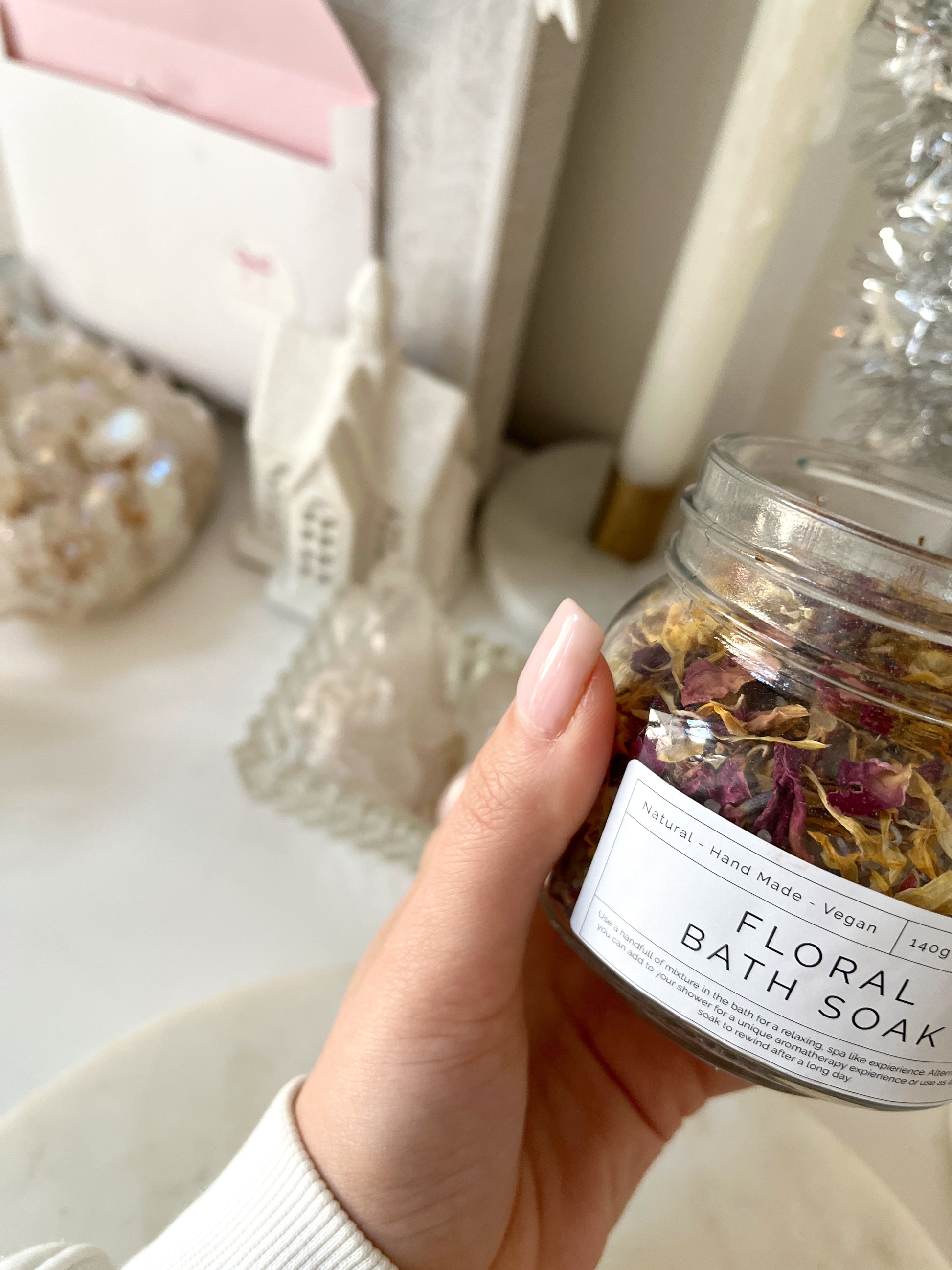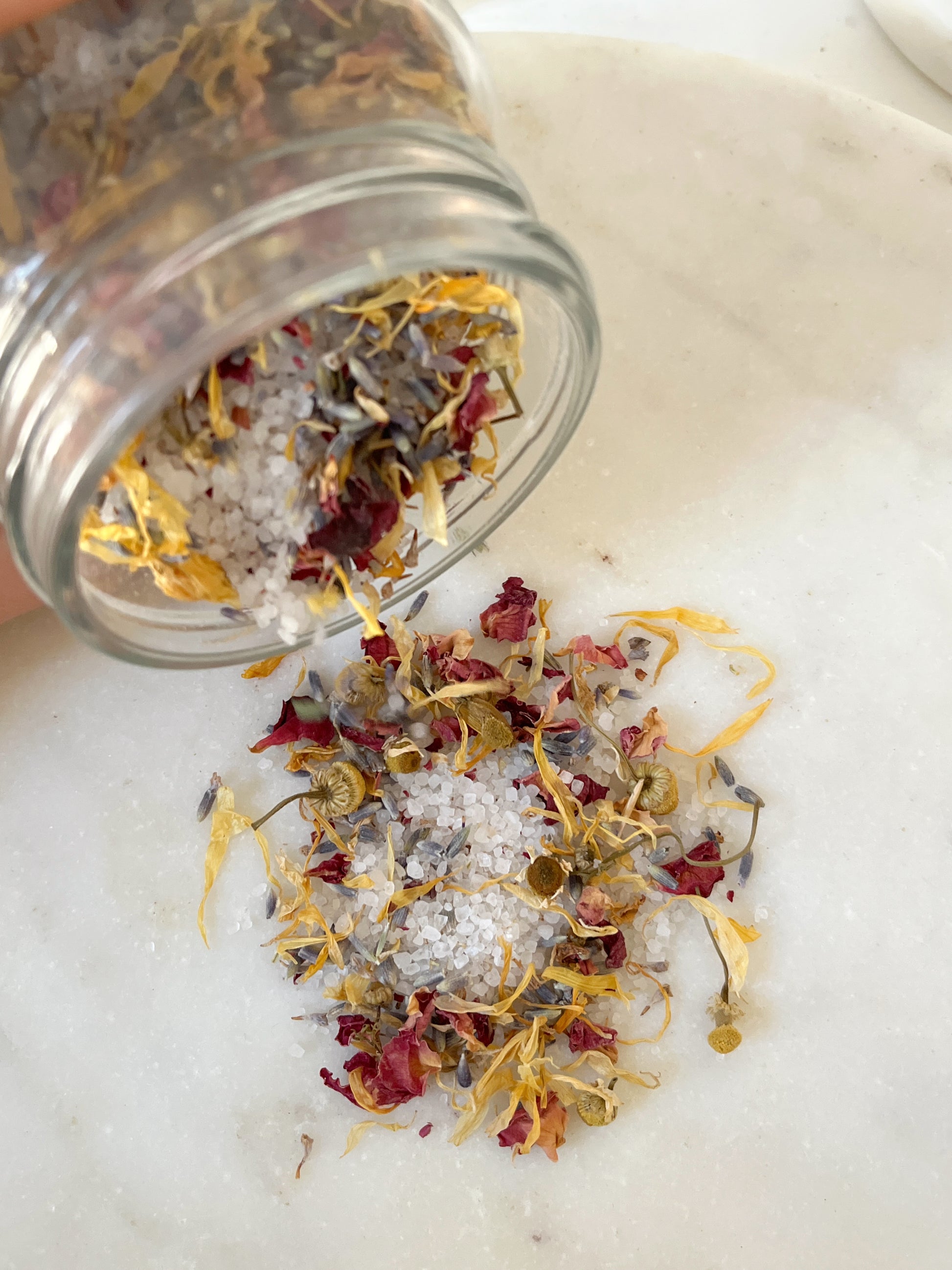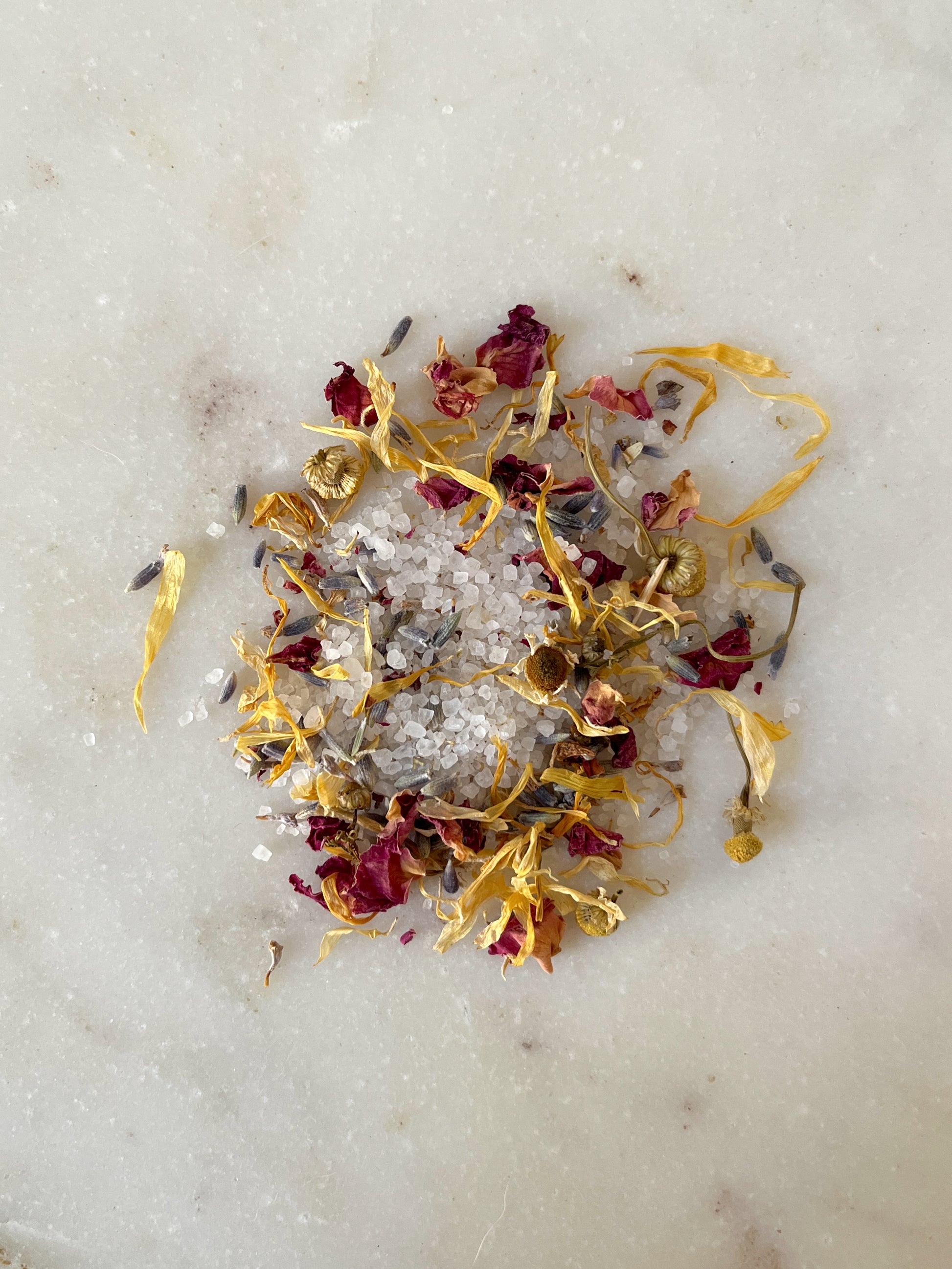 Kwiatowa sól do kąpieli – mieszanka soli morskiej, lawendy, róży, rumianku i nagietka.