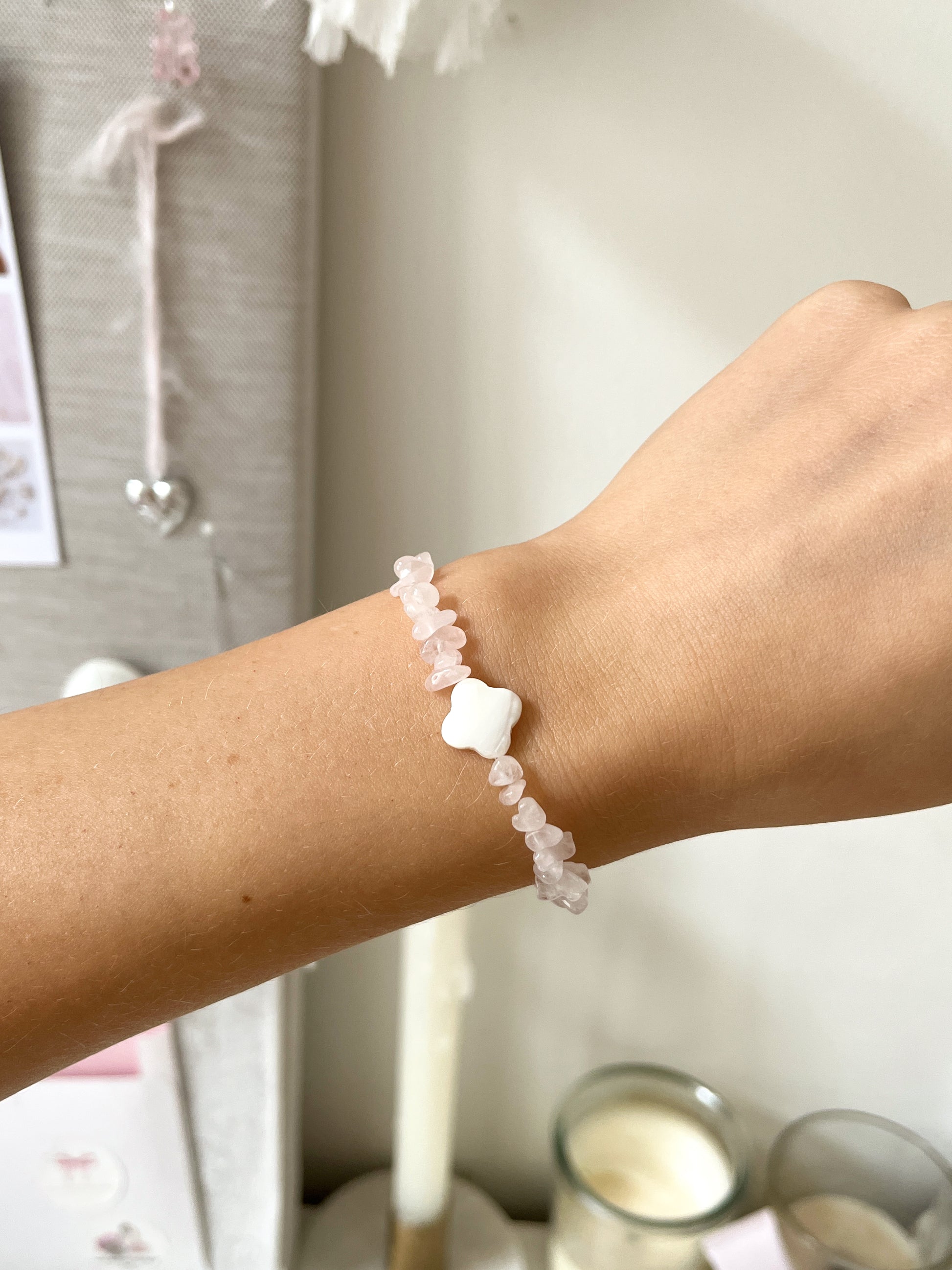 Bransoletka z różowego kwarcu lub z kryształu górskiego z koniczynką z masy perłowej na gumce. Ze względu na to, że minerały są NATURALNE - produkty mogą się nieco różnić kolorem/ kształtem. Inkluzje, nierówności to naturalne cechy minerałów.