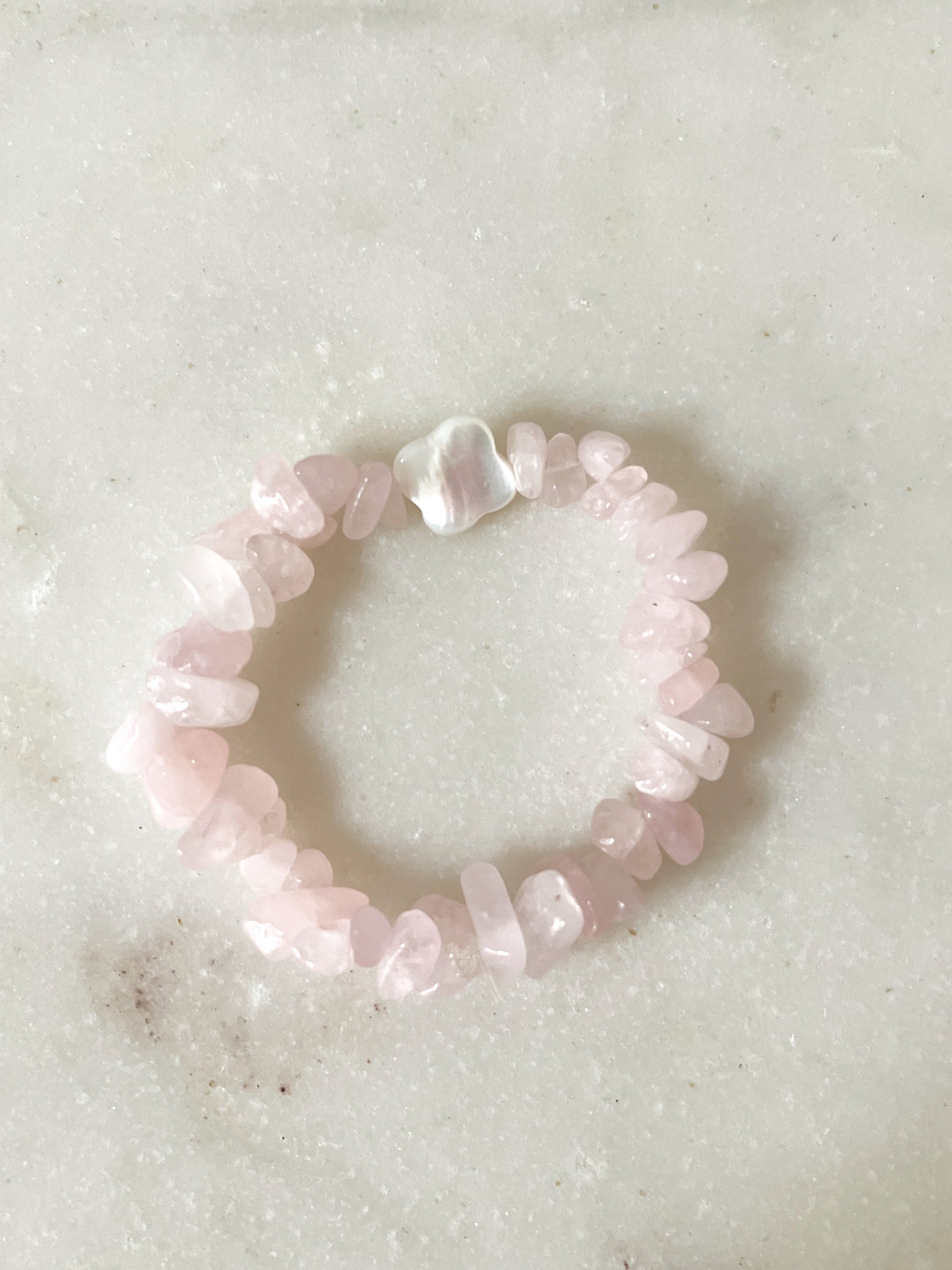 Bransoletka z różowego kwarcu z koniczynką z masy perłowej na gumce. Ze względu na to, że minerały są NATURALNE - produkty mogą się nieco różnić kolorem/ kształtem. Inkluzje, nierówności to naturalne cechy minerałów.