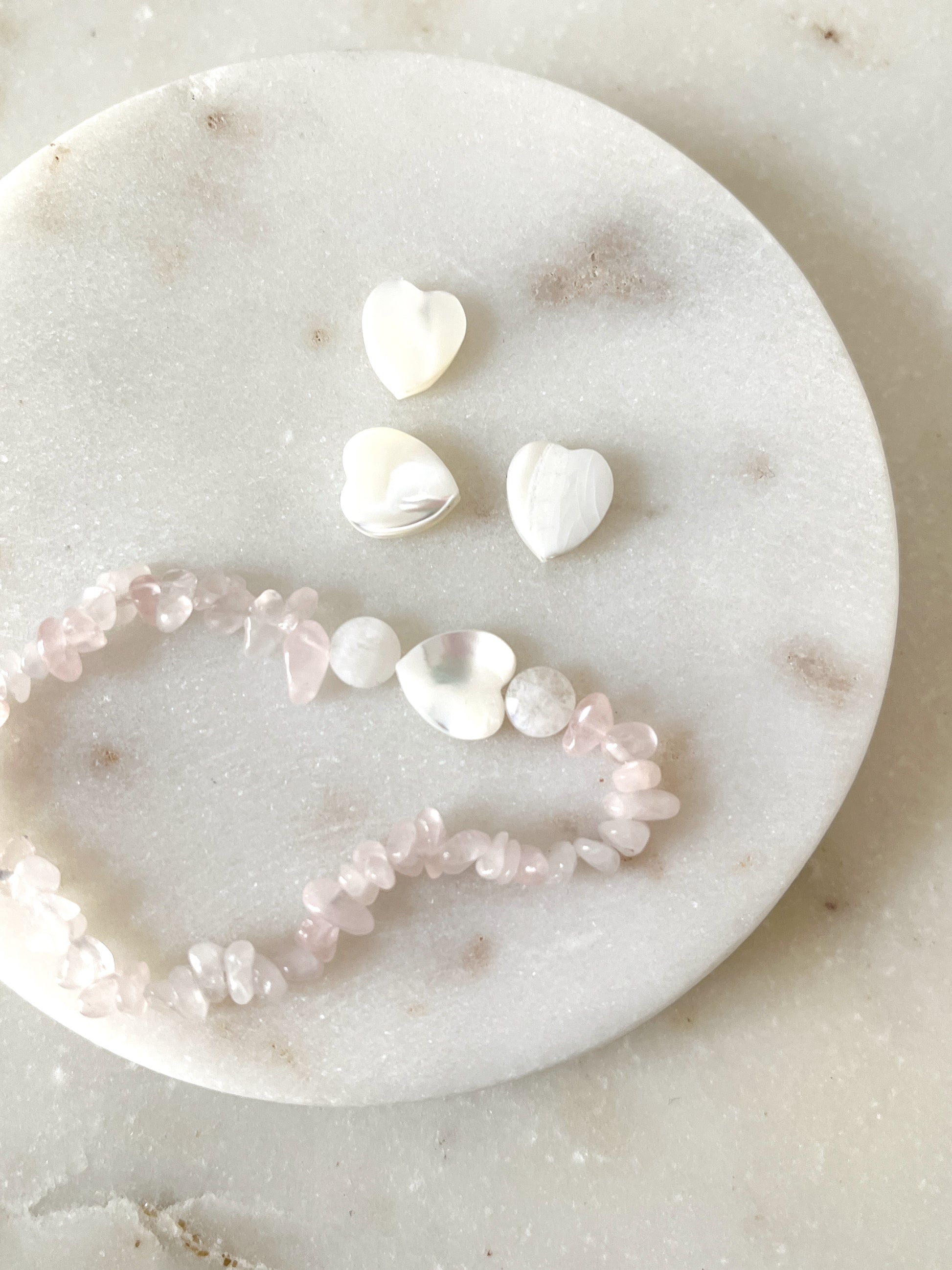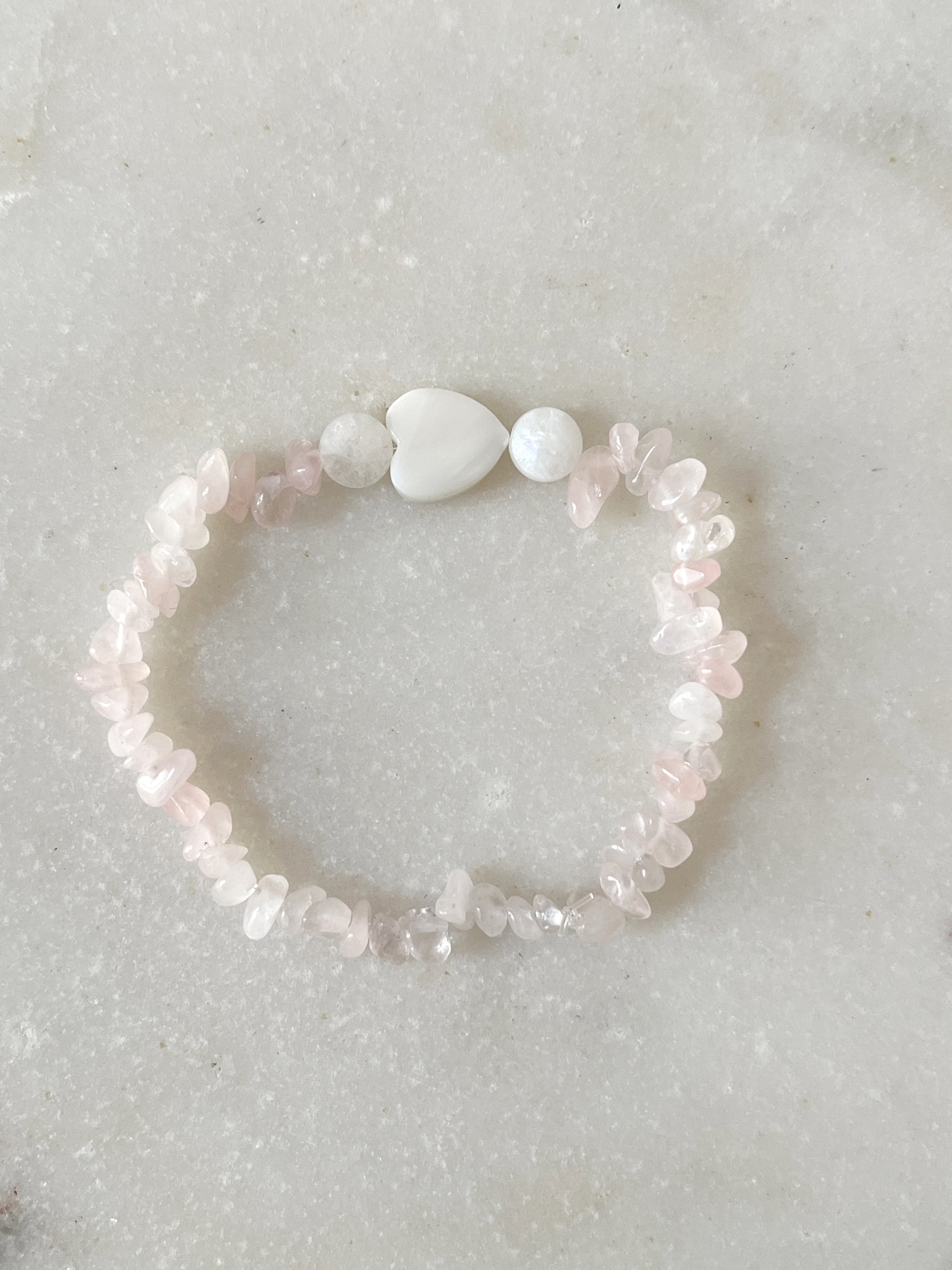 Bransoletka z różowego kwarcu i kamienia księżycowego, z serduszkiem z masy perłowej na gumce. Ze względu na to, że minerały są NATURALNE - produkty mogą się nieco różnić kolorem/ kształtem. Inkluzje, nierówności to naturalne cechy minerałów.