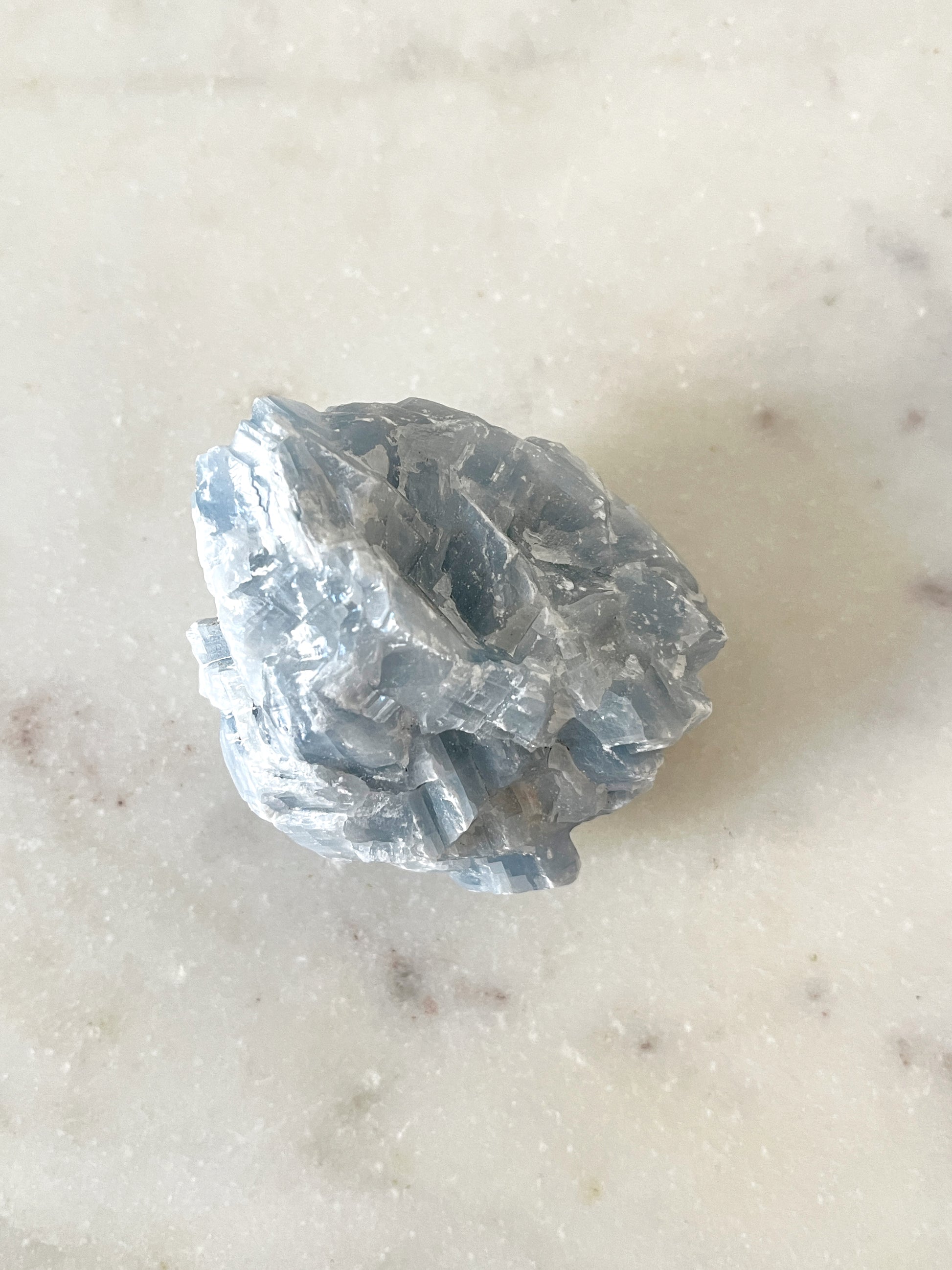 Kalcyt niebieski - pomaga wyciszyć umysł i odnaleźć spokój wewnętrzny. Wspiera w odcinaniu się od wpływu zewnętrznego świata, umożliwiając lepsze skupienie na wewnętrznych potrzebach i pragnieniach. Pomocny w praktykowaniu uważności, pozwala otworzyć się na intuicję.