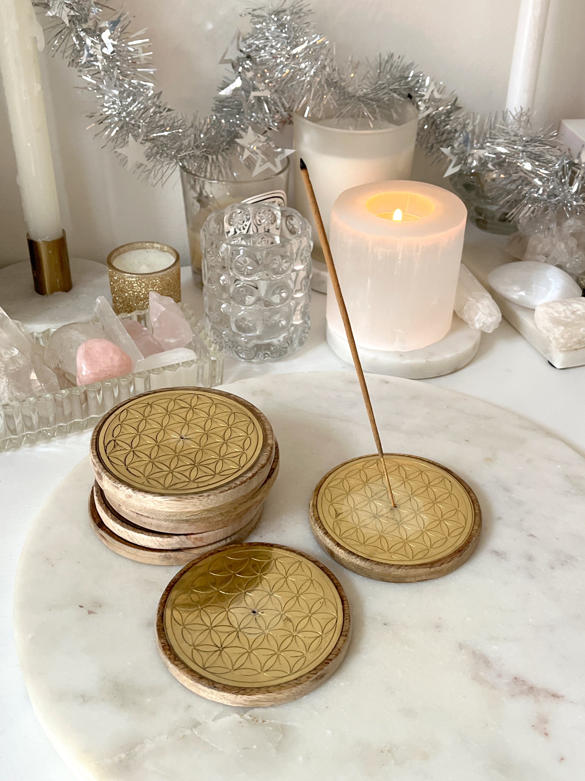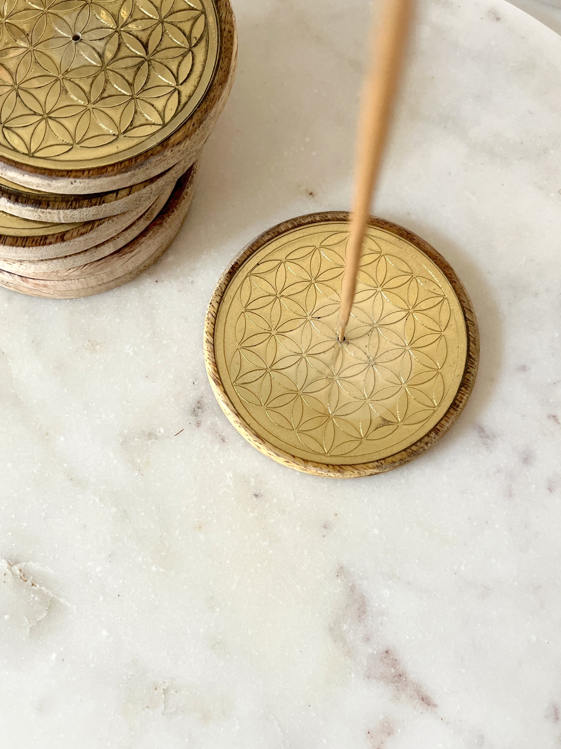 Podstawka pod kadzidełka wykonana w Indiach z drzewa mango i złotego metalu z motywem Kwiatu Życia. Ten magiczny wzór emanuje spokojem i pozytywną energią, pomagając stworzyć uduchowione i harmonijne miejsce do medytacji i relaksu.