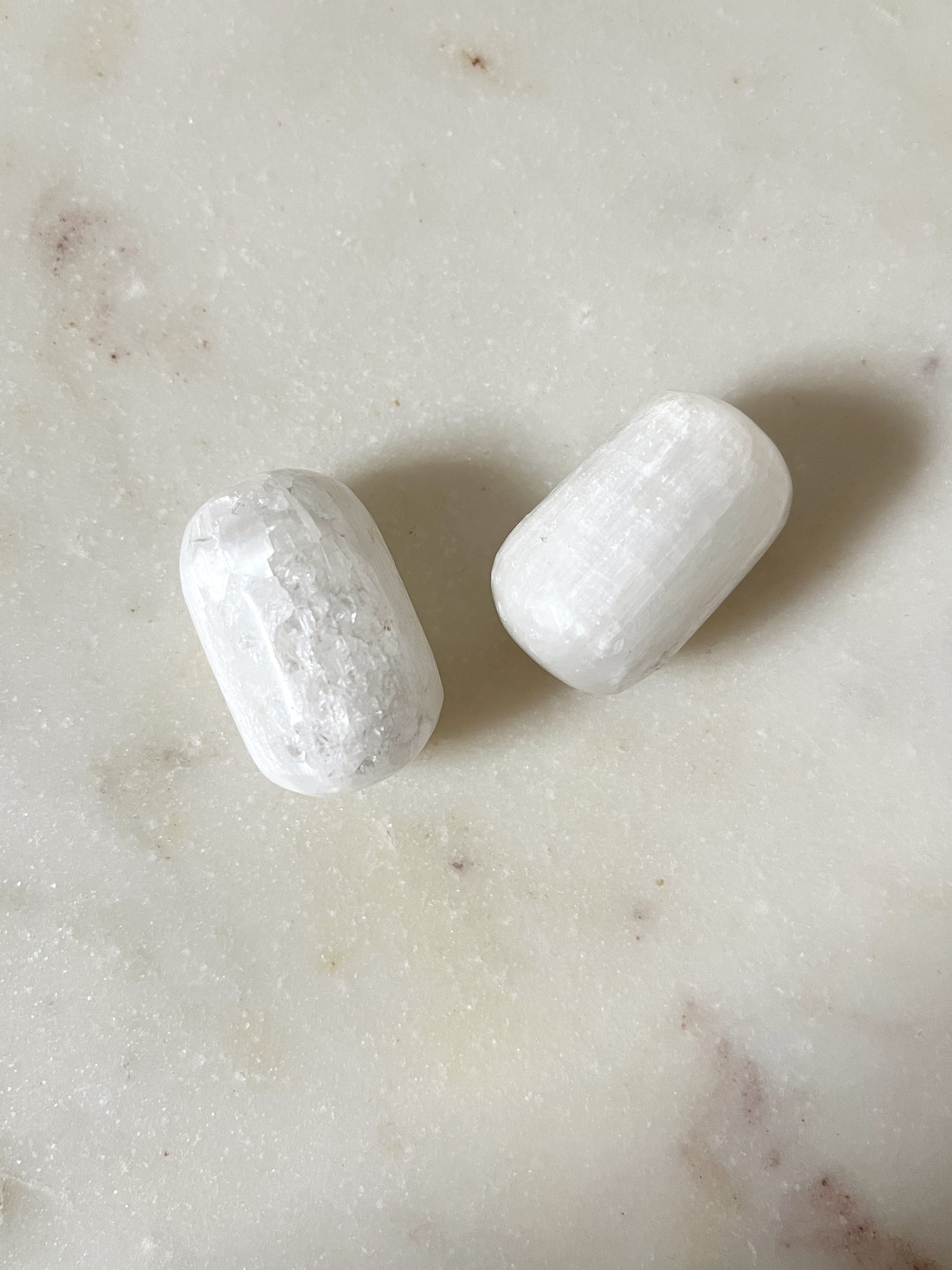 Selenit – kamień o działaniu oczyszczającym, wyciszającym i uspokajającym. Pomaga w uzyskaniu jasności umysłu (doskonale nada się zatem do medytacji), ułatwia też zapanowanie nad chaosem zarówno w otoczeniu, jak i we własnej głowie. Poprawia jakość snu, stabilizuje emocje, daje poczucie bezpieczeństwa. Używany do oczyszczania innych minerałów, pochłaniania negatywnej energii z otoczenia.